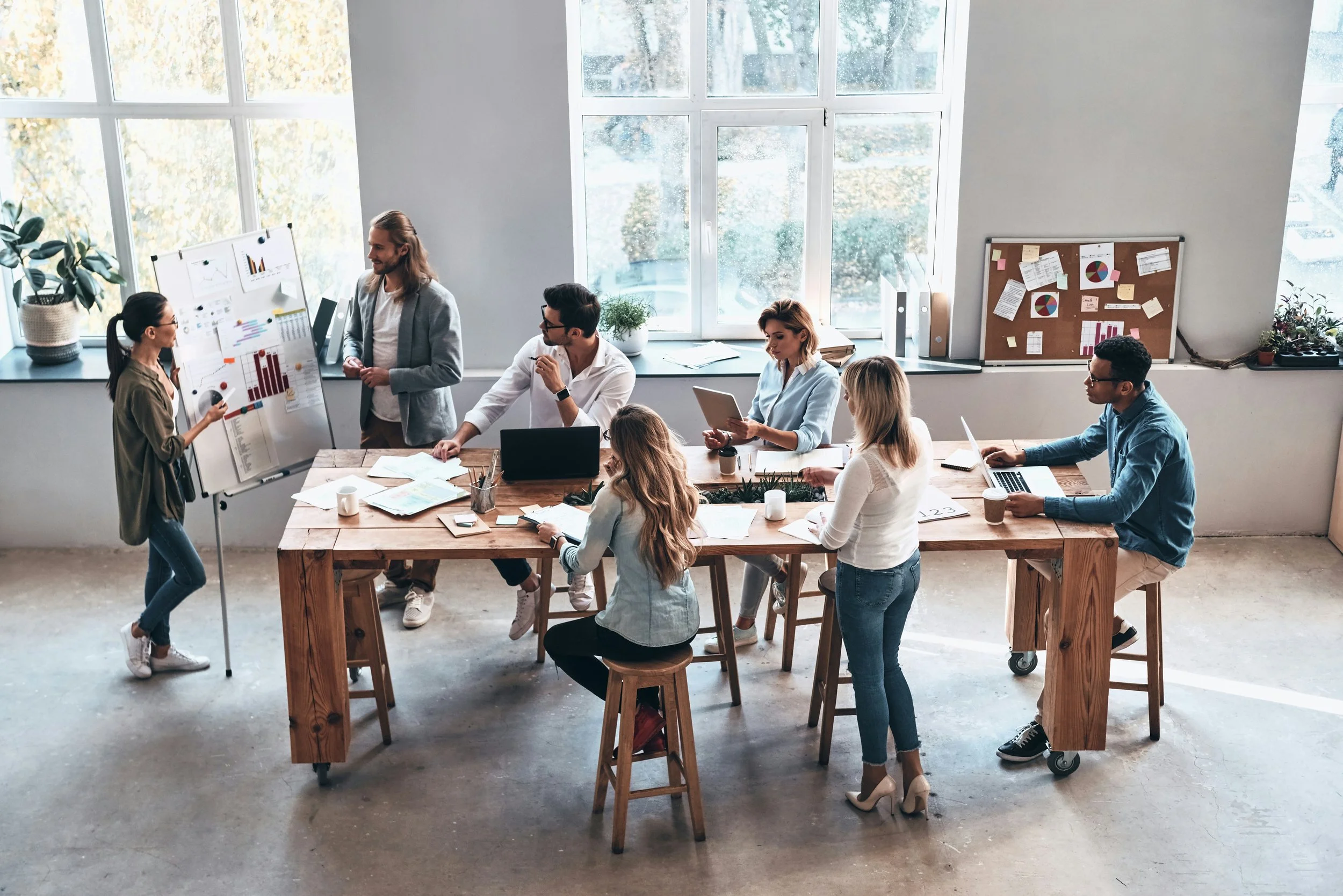 A group of diverse professionals in a modern office meeting room, participating in a presentation. A woman is standing at a whiteboard with charts, while a man is watching her and others are seated at a wooden table with laptops, tablets, papers, and coffee cups.
