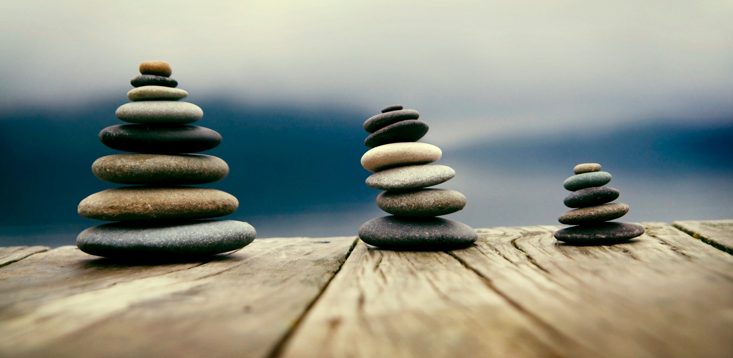 Stacks of smooth, rounded stones balanced on a weathered wooden surface against a cloudy sky.