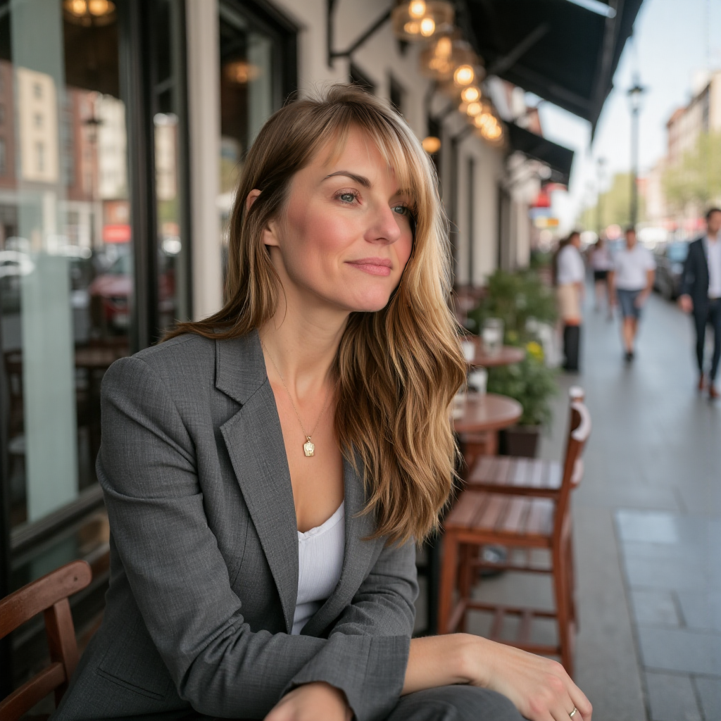 A woman with long, wavy blonde hair sitting at an outdoor cafe on a city sidewalk, wearing a gray blazer and a white top, looking thoughtfully into the distance.